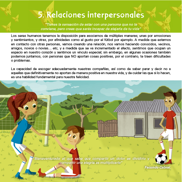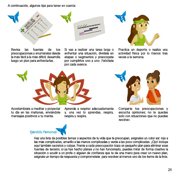 Las situaciones propuestas en las ilustraciones buscan reflejar circunstancias comunes y rutinarias en las escuelas, los espacios donde los estudiantes comparten y pasan mayor parte de su tiempo. Por otro lado, en los tips, se ilustraron situaciones con las que los estudiantes podrían relacionarse e identificarse.